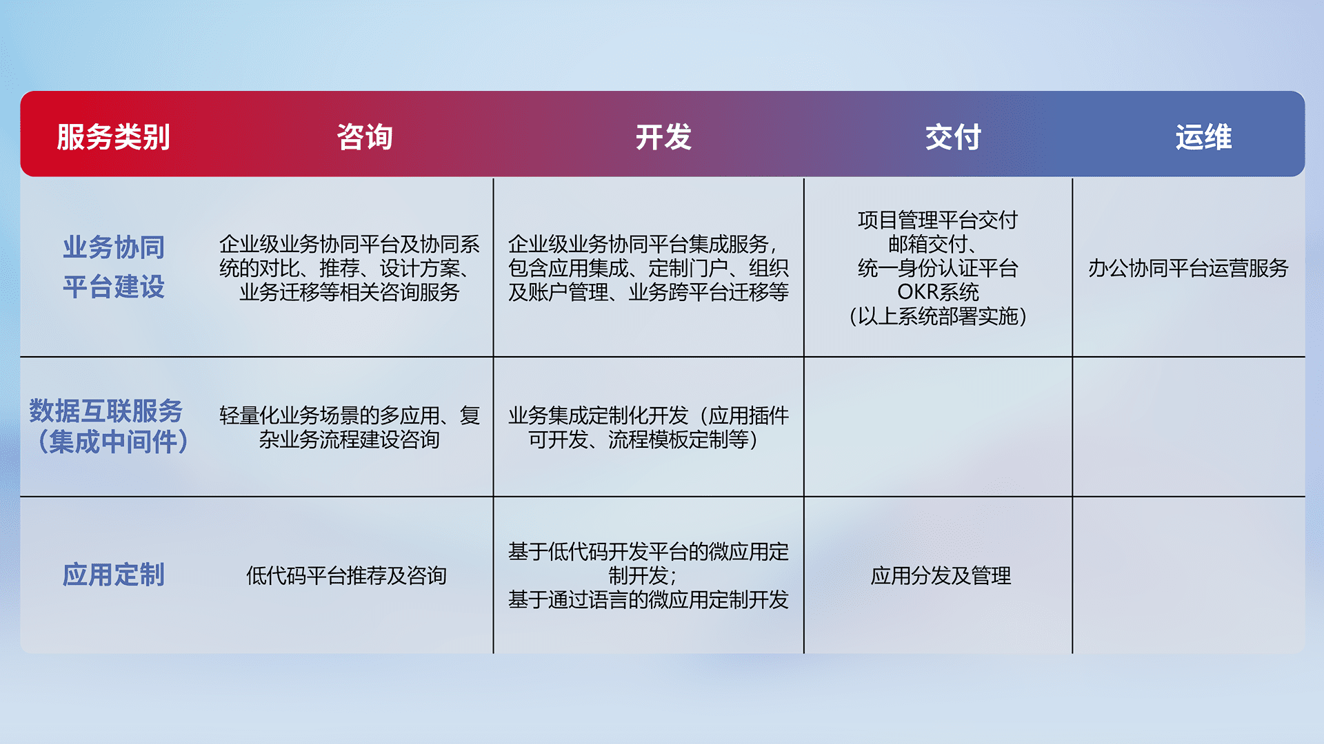 针对钉钉、、企微、、、、IDaas等平台级产品提供产品的规划、、方案、、交付、、定制化开发等服务,,,实现如统一协同办公、、、智能客户服务、、混合会议管理、、、智能数据查询、、、、等业务场景,,,实现数字化转型。。